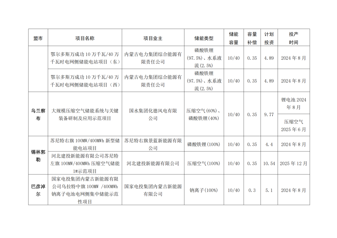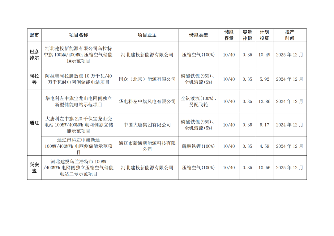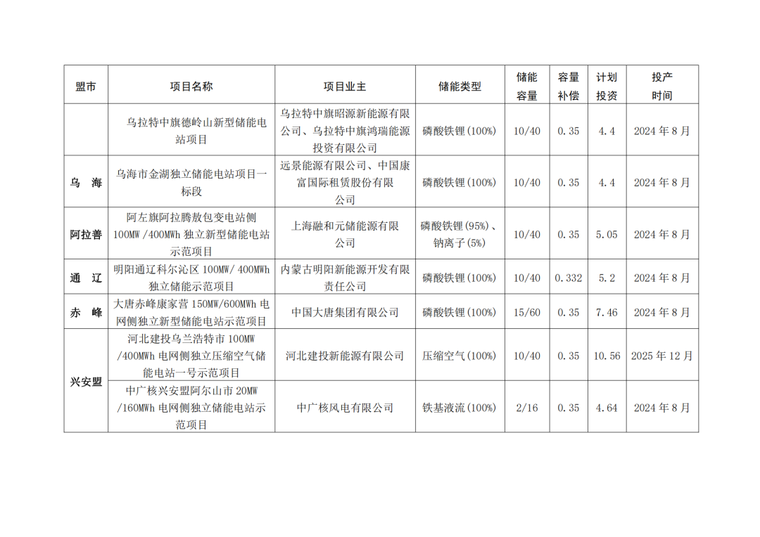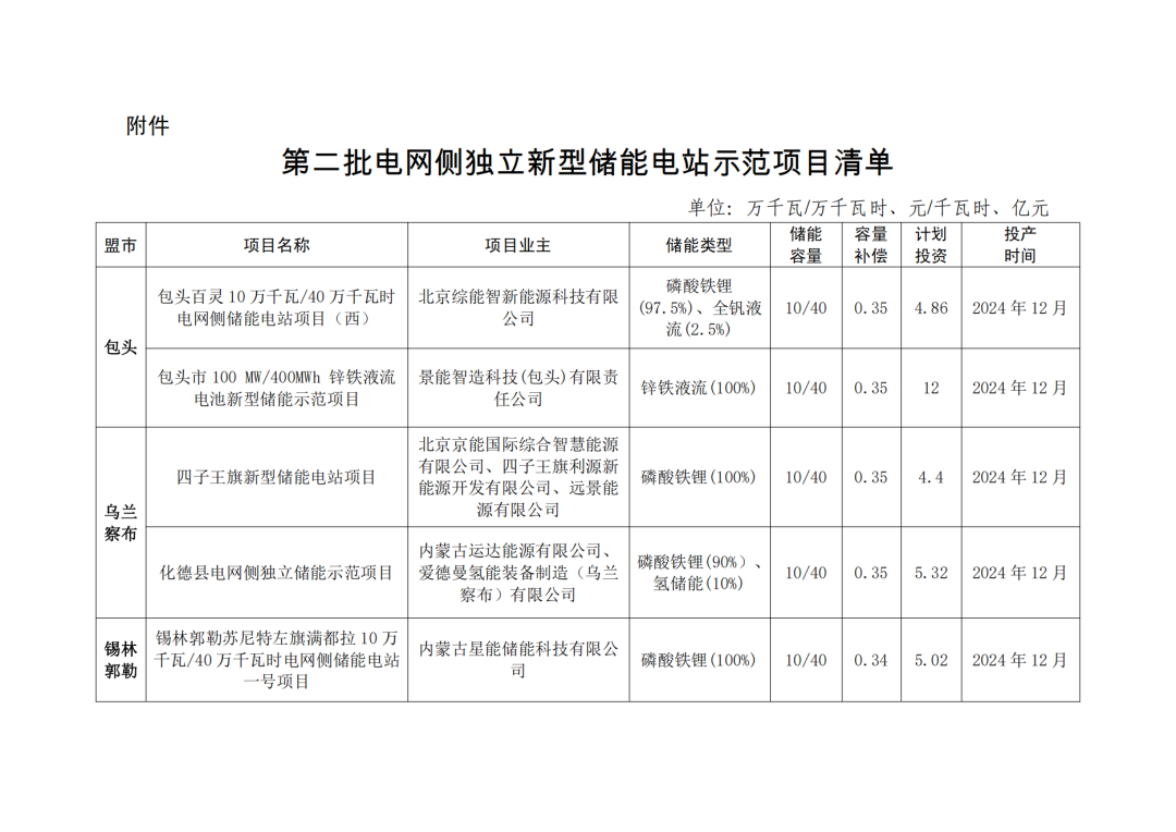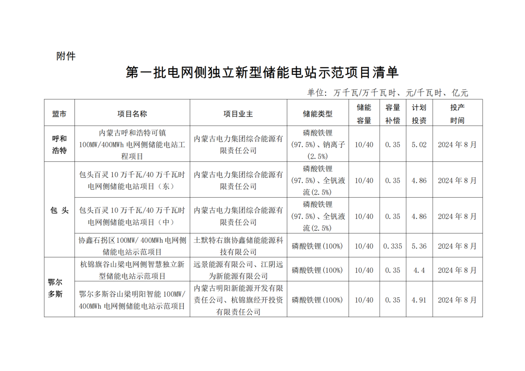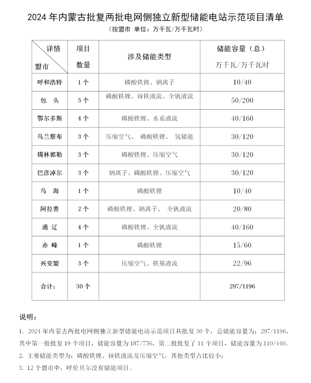 内蒙古自治区2024年批复的30个电网侧独立新型储能项目清单