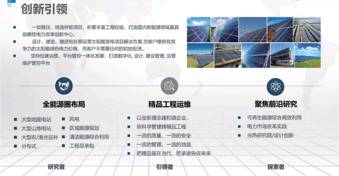 02 先进理念。一直致力于光热发电、光伏发电、风力发电、生物质发电,储能系统,智能充电,光伏车棚和智能微型电网等业务,专注于构建和推广多能互补,源网荷储协同,风光储充一体化及综合能源智能微网的先进理念。