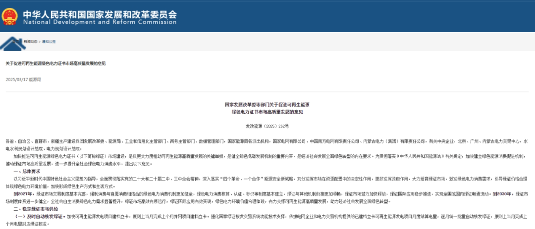各省、自治区、直辖市、新疆生产建设兵团发展改革委、能源局、工业和信息化主管部门、商务主管部门、数据管理部门,国家能源局各派出机构,国家电网有限公司、中国南方电网有限责任公司、内蒙古电力(集团)有限责任公司,有关中央企业,北京、广州、内蒙古电力交易中心,水电水利规划设计总院、电力规划设计总院:??加快推进可再生能源绿色电力证书(以下简称绿证)市场建设,是以更大力度推动可再生能源高质量发展的关键举措,是健全绿色低碳发展机制的重要内容,是经济社会发展全面绿色转型的内在要求。为贯彻落实《中华人民共和国能源法》有关规定,加快建立绿色能源消费促进机制,推动绿证市场高质量发展,进一步提升全社会绿色电力消费水平,提出以下意见。??以习近平新时代中国特色社会主义思想为指导,全面贯彻落实党的二十大和二十届二中、三中全会精神,深入落实“四个革命、一个合作”能源安全新战略,充分发挥市场在资源配置中的决定性作用,更好发挥政府作用,大力培育绿证市场,激发绿色电力消费需求,引导绿证价格合理体现绿色电力环境价值,加快形成绿色生产方式和生活方式。??到2027年,绿证市场交易制度基本完善,强制消费与自愿消费相结合的绿色电力消费机制更加健全,绿色电力消费核算、认证、标识等制度基本建立,绿证与其他机制衔接更加顺畅,绿证市场潜力加快释放,绿证国际应用稳步推进,实现全国范围内绿证畅通流动。到2030年,绿证市场制度体系进一步健全,全社会自主消费绿色电力需求显著提升,绿证市场高效有序运行,绿证国际应用有效实现,绿色电力环境价值合理体现,有力支撑可再生能源高质量发展,助力经济社会发展全面绿色转型。??(一)及时自动核发绿证。加快可再生能源发电项目建档立卡,原则上当月完成上个月并网项目建档立卡。强化国家绿证核发交易系统功能技术支撑,依据电网企业和电力交易机构提供的已建档立卡可再生能源发电项目月度结算电量,逐月统一批量自动核发绿证,原则上当月完成上个月电量对应绿证核发。??(二)提升绿色电力交易规模。加快提升以绿色电力和对应绿色电力环境价值为标的物的绿色电力交易规模,稳步推动风电(含分散式风电和海上风电)、太阳能发电(含分布式光伏发电和光热发电),以及生物质发电、地热能发电、海洋能发电等可再生能源发电项目参与绿色电力交易。??(三)健全绿证核销机制。完善绿证全生命周期闭环管理,规范绿证核销机制。对已声明完成绿色电力消费的绿证,依据绿色电力消费认证凭证或其他声明材料予以核销;对未交易或已交易但未声明完成绿色电力消费的绿证,超过有效期后自动予以核销;对申请中国核证自愿减排量(CCER)的深远海海上风电、光热发电项目,在完成减排量核查和登记后,对减排量对应的绿证予以核销。??(四)支持绿证跨省流通。推动绿证在全国范围内合理流通,各地区不得以任何方式限制绿证交易区域。支持发用双方自主参与绿证交易或绿色电力交易,推动绿证在更大范围内优化配置。??(五)明确绿证强制消费要求。依法稳步推进绿证强制消费,逐步提高绿色电力消费比例并使用绿证核算。加快提升钢铁、有色、建材、石化、化工等行业企业和数据中心,以及其他重点用能单位和行业的绿色电力消费比例,到2030年原则上不低于全国可再生能源电力总量消纳责任权重平均水平;国家枢纽节点新建数据中心绿色电力消费比例在80%基础上进一步提升。在有条件的地区分类分档打造一批高比例消费绿色电力的绿电工厂、绿电园区等,鼓励其实现100%绿色电力消费。将绿色电力消费信息纳入上市企业环境、社会和公司治理(ESG)报告体系。??(六)健全绿证自愿消费机制。鼓励相关用能单位在强制绿色电力消费比例之上,进一步提升绿色电力消费比例。发挥政府部门、事业单位、国有企业引领作用,稳步提升绿色电力消费水平。鼓励企业主动披露绿色电力消费情况。鼓励行业龙头企业、跨国公司及其产业链企业、外向型企业打造绿色产业链供应链,逐年提高绿色电力消费比例,协同推进企业绿色转型。建设一批高比例消费绿色电力的绿电建筑、绿电社区。推广绿色充电桩,支持新能源汽车充绿电。鼓励居民消费绿色电力,推动电网企业、绿证交易平台等机构为居民购买绿证提供更便利服务,将绿色电力消费纳入绿色家庭、绿色出行等评价指标。研究建立以绿证为基础的绿色电力消费分档分级标识。??(七)完善金融财政相关支持政策。加大绿色金融对企业、产品和活动等开展绿色电力消费的支持力度,强化绿色信贷支持。将绿色电力消费要求纳入绿色产品评价标准,研究制定政府采购支持绿色产品政策。??(八)健全绿证市场价格机制。健全绿证价格形成机制,加强绿证价格监测,研究建立绿证价格指数,引导绿证价格在合理水平运行。参考绿证单独交易价格,合理形成绿色电力交易中的绿证价格。??(九)优化绿证交易机制。完善全国统一的绿证交易体系,强化绿证交易平台建设。推动发用双方签订绿证中长期购买协议。支持代理机构参与分布式新能源发电项目绿证核发和交易。加快设立省级绿证账户,完善电网代理购电相应存量水电绿证的划转机制。??(十)完善绿色电力交易机制。推进多年、年度、月度以及月内绿色电力交易机制