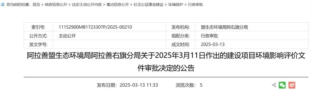 3月13日,阿拉善右旗人民政府发布建设项目环境影响评价文件审批决定的公告,同意景新塔木素40万千瓦防沙治沙光伏项目建设。