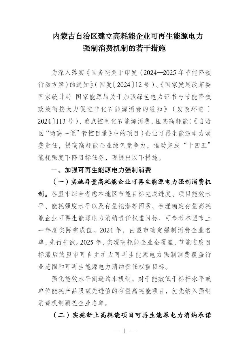 内蒙古发改委公开征求《内蒙古自治区建立高耗能企业可再生能源电力强制消费机制的若干措施》意见的公告