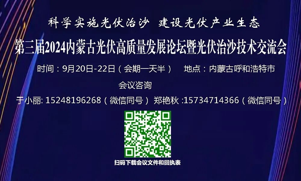 为贯彻落实党的二十届三中全会精神,加快建设国家重要能源和战略资源基地,研讨内蒙古光伏发展面临的新挑战、新路径、新机遇,推动防沙治沙与光伏开发有机融合,搭建设备厂家与投资企业、EPC、电网、设计院和政府有关部门的交流合作平台,在自治区有关部门的指导下,内蒙古太阳能行业协会决定召开“第三届2024内蒙古光伏高质量发展论坛暨光伏治沙技术交流会"。本届论坛的主题是“科学推进光伏治沙,建设光伏产业生态”。 (二)协办单位(暂定):隆基绿能科技股份有限公司、华为数字能源技术有限公司、特变电工新疆新能源股份有限公司、一道新能源科技股份有限公司、内蒙古包钢钢联股份有限公司、内蒙古绿能新能源有限责任公司、北京曼德克环境科技有限公司、内蒙古鲁班装配式建筑科技有限公司等。 (三)支持单位:国家发改委能源研究所、内蒙古电力交易中心有限公司、内蒙古电力集团经济技术研究有限责任公司、内蒙古电力勘测设计院有限责任公司、内蒙古农业大学、内蒙古自治区气象服务中心、北京骅迅碳创管理技术服务有限公司、内蒙古新能源网等。 (一)时间:2024年9月20日-22日(会期一天半) (二)地点:呼和浩特市发展大厦酒店( 地址:呼和浩特市赛罕区敕勒川大街发展大厦A座,酒店总机:0471-5287777) (一)内蒙古新能源大基地、防沙治沙与光伏一体化工程规划和建设进展; (二)内蒙古新能源大基地、防沙治沙与光伏一体化工程电网规划和建设进展; (五)高效组件助力内蒙古新能源大基地和防沙治沙与光伏一体化项目多发电、多收益; (六)逆变器、支架、管桩等新产品、新技术在内蒙古新能源大基地和防沙治沙与光伏一体化项目上的应用; (八)内蒙古新型储能政策解读、投资收益分析及趋势展望; 五大六小等光伏发电站投资企业、EPC、设备厂家、设计、监理、建设单位、高校、金融、林草、生态治理、政府有关部门以及协会会员单位和专家委员等,预计会议规模300人左右。