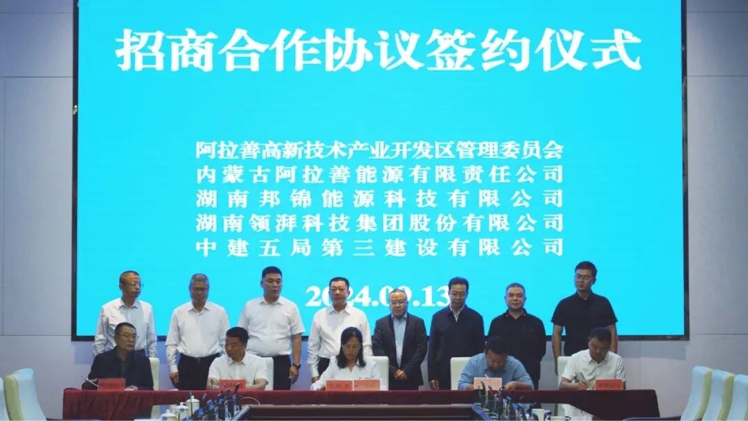 高新区、示范区党工委书记柳仙德,高新区党工委副书记、管委会主任田学明,湖南邦锦能源科技有限公司董事长邹华,湖南领湃科技集团有限公司相关领导,中建五局第三建设有限公司安装公司党委副书记、纪委书记、工会主席吴聪,阿拉善盟产业发展和能源投资集团有限公司党委书记、董事长张建国出席签约仪式。