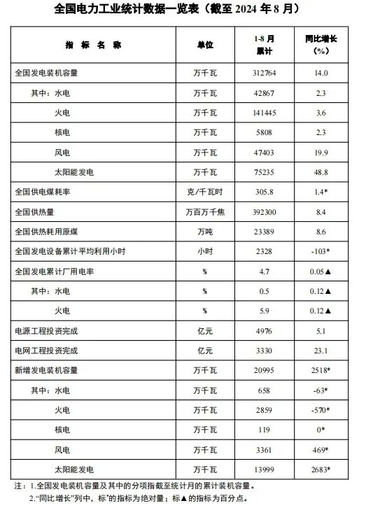 9月23日,国家能源局发布2024年1-8月份全国电力工业统计数据。截至8月底,全国累计发电装机容量约31.3亿千瓦,同比增长14.0%。其中,太阳能发电装机容量约7.5亿千瓦,同比增长48.8%;风电装机容量约4.7亿千瓦,同比增长19.9%。1-8月份,全国发电设备累计平均利用2328小时,比上年同期减少103小时。1-8月份,全国主要发电企业电源工程完成投资4976亿元,同比增长5.1%。电网工程完成投资3330亿元,同比增长23.1%。1-8月,太阳能发电新增装机13999万千瓦,其中8月新增装机1646万千瓦,同比增长2.88%。2023年、2024年1~8月光伏新增装机见下: