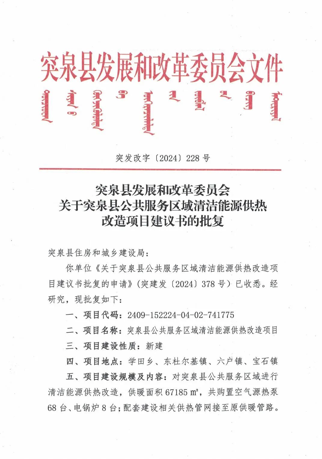 突泉县发展和改革委员会关于突泉县公共服务区域清洁能源供热改造项目建议书的批复
