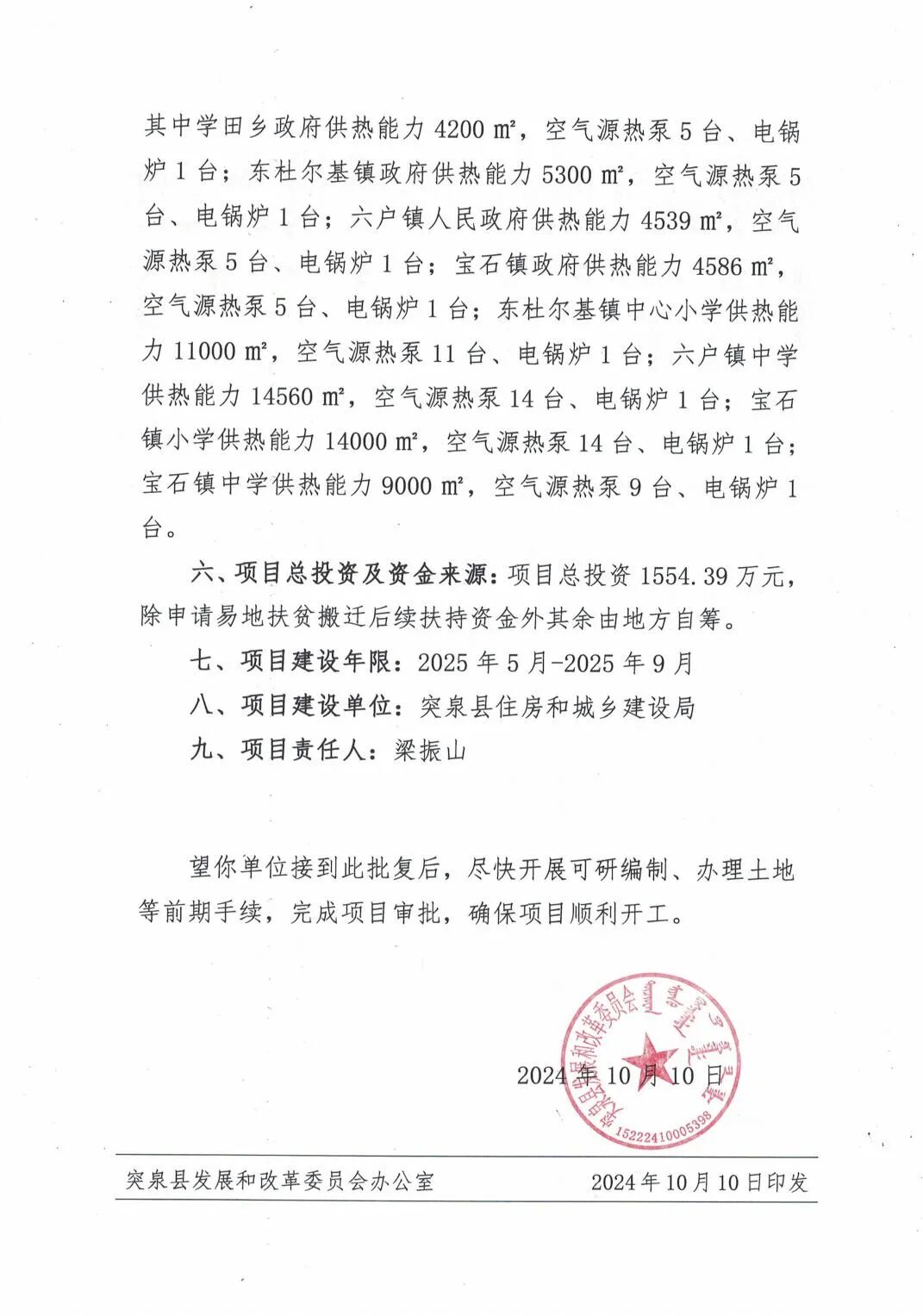 内蒙古自治区兴安盟科尔沁右翼前旗桃合木苏木乌申一合嘎查地区清洁能源储能供暖建设项目项目备案告知书项目代码:2410-152221-04-01-146895您提交的内蒙古自治区兴安盟科尔沁右翼前旗桃合木苏木乌申一合嘎查地区清洁能源储能供暖建设项目 能源类的项目备案项目,符合产业政策和市场准入标准,准予备案。请据此开展有关工作。在开工建设前,应当办理法律法规要求的其他手续,方可开工。特此告知!建设地点:兴安盟--科尔沁右翼前旗--兴安盟-科尔沁右翼前旗-内蒙古自治区兴安盟科尔沁右翼前 旗桃合木苏木乌申一合嘎查地区总投资:520万元,其中自有资金:520 万元 , 申请银行贷款:0万元 , 其他0 万元建设规模及内容:使用固体储能电锅炉供热,同时使用智能远程管理系统,供热面积:约21076平米,共2台固体储能电锅炉,使用1台1000千瓦固体储能电锅炉供热,1台144千瓦固体储能电锅炉供热.(注意:项目自备案2年内未开工建设或者未办理任何其他手续的,项目单位如果 决定继续实施该项目,请通过在线平台作出说明;如果不再继续实施,请申请撤销已 备案项目,2年期满后仍未作出说明并未撤销的,备案机关将删除已备案项目并在在线平台公示。)http://nmg.tzxm.gov.cn/project/gsSegvDsgger.jspx?cbsnum=20241016091824875N&captcha=YXFncXQ=