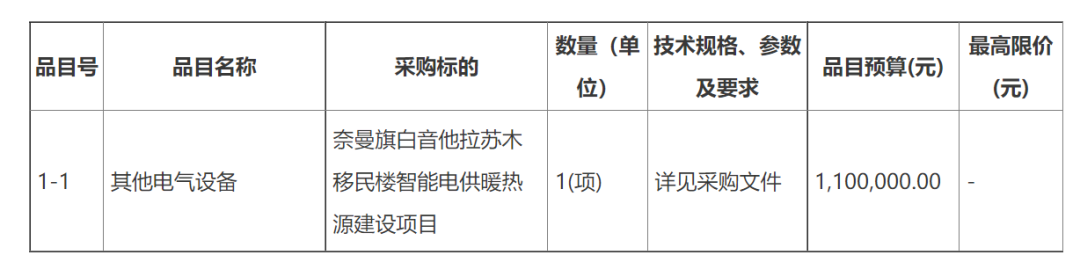 奈曼旗白音他拉苏木人民政府奈曼旗白音他拉苏木移民楼智能电供暖热源建设项目招标公告奈曼旗白音他拉苏木移民楼智能电供暖热源建设项目招标项目的潜在投标人应在内蒙古自治区政府采购网获取招标文件,并于2024年11月07日 09时00分 (北京时间)前递交投标文件。项目名称:奈曼旗白音他拉苏木移民楼智能电供暖热源建设项目合同包1(奈曼旗白音他拉苏木移民楼智能电供暖热源建设项目):