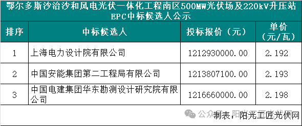 10月28日,鄂尔多斯市库布其新能源有限公司杭锦旗防沙治沙和风电光伏一体化工程南区500MW光伏场及220kV升压站EPC工程中标候选人公示,上海电力设计院有限公司以2.192元/瓦位列第一候选人。招标人为鄂尔多斯市库布其新能源有限公司。