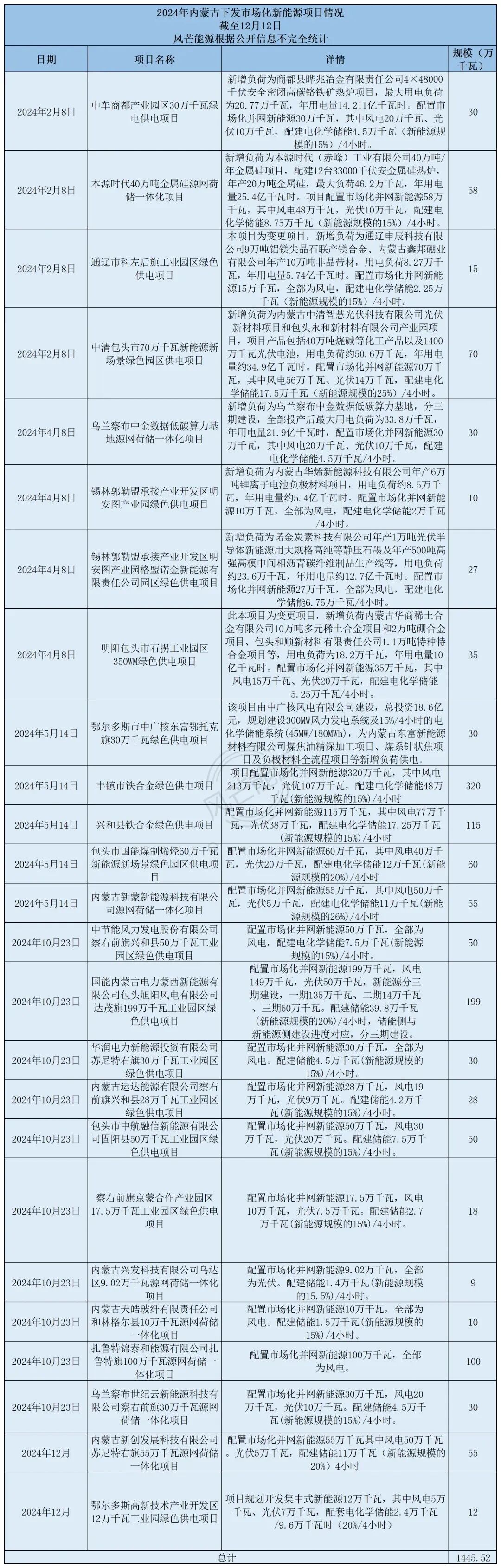 根据公开信息统计,今年以来内蒙古能源局共下发5批市场化新能源项目,规模共计1445.52万千瓦,项目类型涉及绿色供电项目、源网荷储一体化项目等。