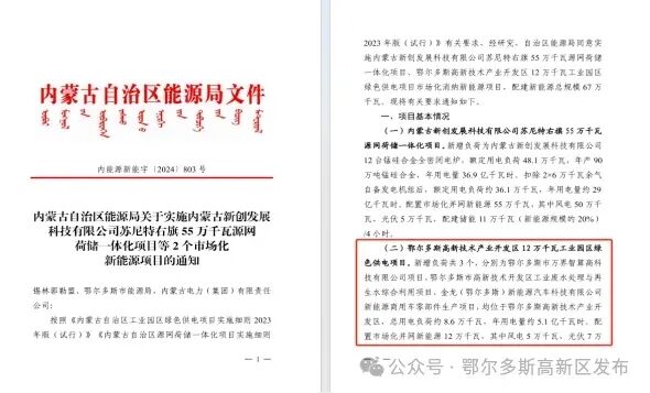 近日,内蒙古自治区能源局发布《关于实施内蒙古新创发展科技有限公司苏尼特右旗55万千瓦源网荷储一体化项目等2个市场化新能源项目的通知》。《通知》显示,自治区同意实施内蒙古新创发展科技有限公司苏尼特右旗55万千瓦源网荷储一体化项目,鄂尔多斯高新技术产业开发区12万千瓦工业园区绿色供电项目,配建新能源总规模67万千瓦。其中,内蒙古新创发展科技有限公司苏尼特右旗55万千瓦源网荷储一体化项目由内蒙古新创发展科技有限公司投资建设,配置市场化并网新能源55万千瓦。其中风电50万千瓦,光伏5万千瓦,配建储能11万千瓦(新能源规模的20%)4小时。项目新增负荷为内蒙古新创发展科技有限公司12台锰硅合金全密闭电炉,额定用电负荷48.1万千瓦,年产90万吨锰硅合金,年用电量36.9亿千瓦时。扣除2X6万千瓦余气自备发电机组后,额定用电负荷约36.1万千瓦,年用电量约29亿千瓦时。鄂尔多斯高新技术产业开发区12万千瓦工业园绿色供电项目由高新区国企佳奇城投全资子公司佳赫电力公司和市城投诚泰公司联合申报,为园区新建的晶澳污水处理厂、万界智算、金龙重卡3家企业直供绿电。项目规划开发集中式新能源12万千瓦,其中风电5万千瓦、光伏7万千瓦,配套电化学储能2.4万千瓦/9.6万千瓦时(20%/4小时),占地18平方公里,总投资约7亿元,计划于2025年6月开工,争取在2026年6月底前并网运行。