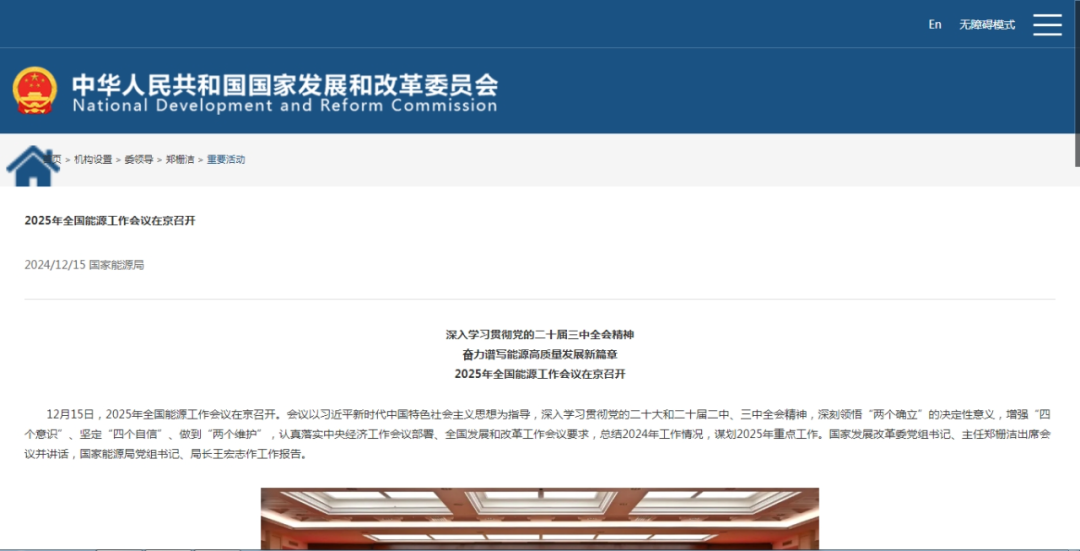 12月15日,2025年全国能源工作会议在京召开。国家发展改革委党组书记、主任郑栅洁出席会议并讲话,国家能源局党组书记、局长王宏志作工作报告。