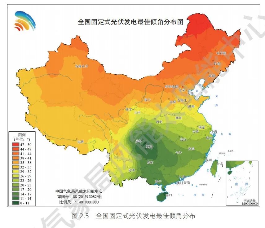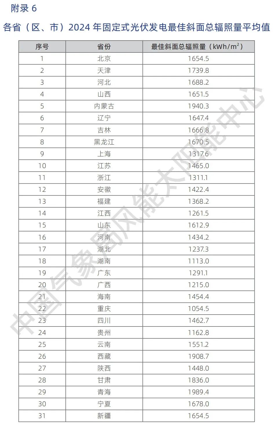 注:固定式光伏发电可利用的太阳能资源是光伏组件按照最佳倾角放置时能够接收的太阳总辐照量(简称“最佳斜面总辐照量”)。根据目前国内的设计经验,按照 80% 的总体系统效率, 计算出固定式光伏电站的首年利用小时数。
