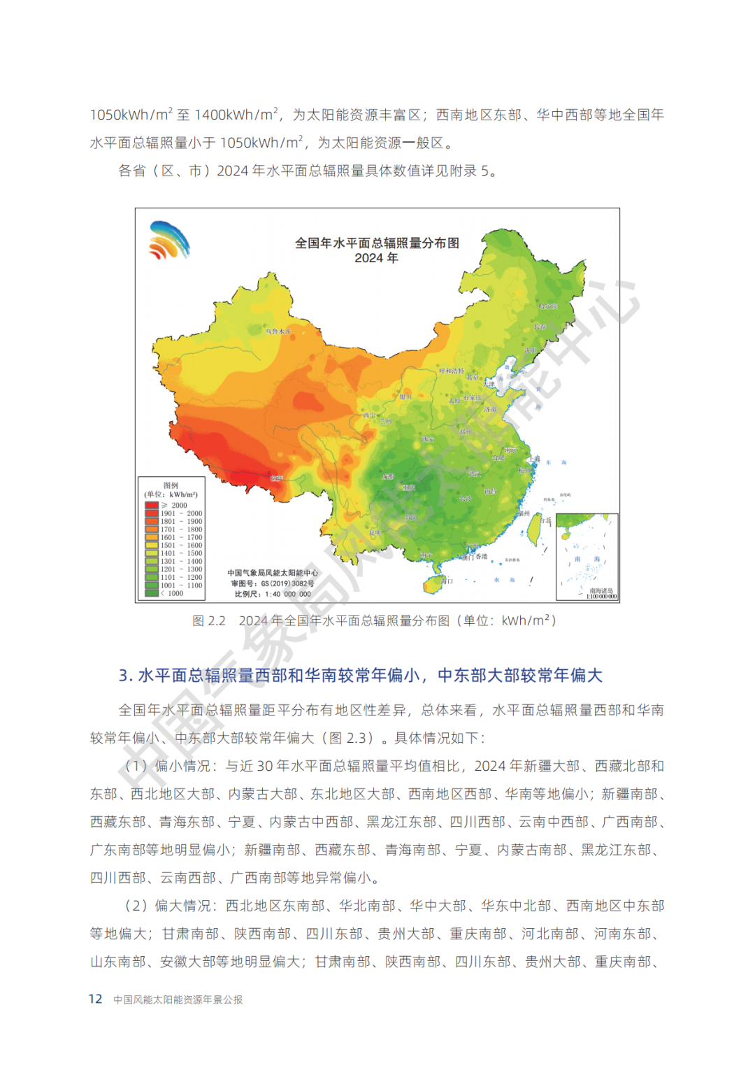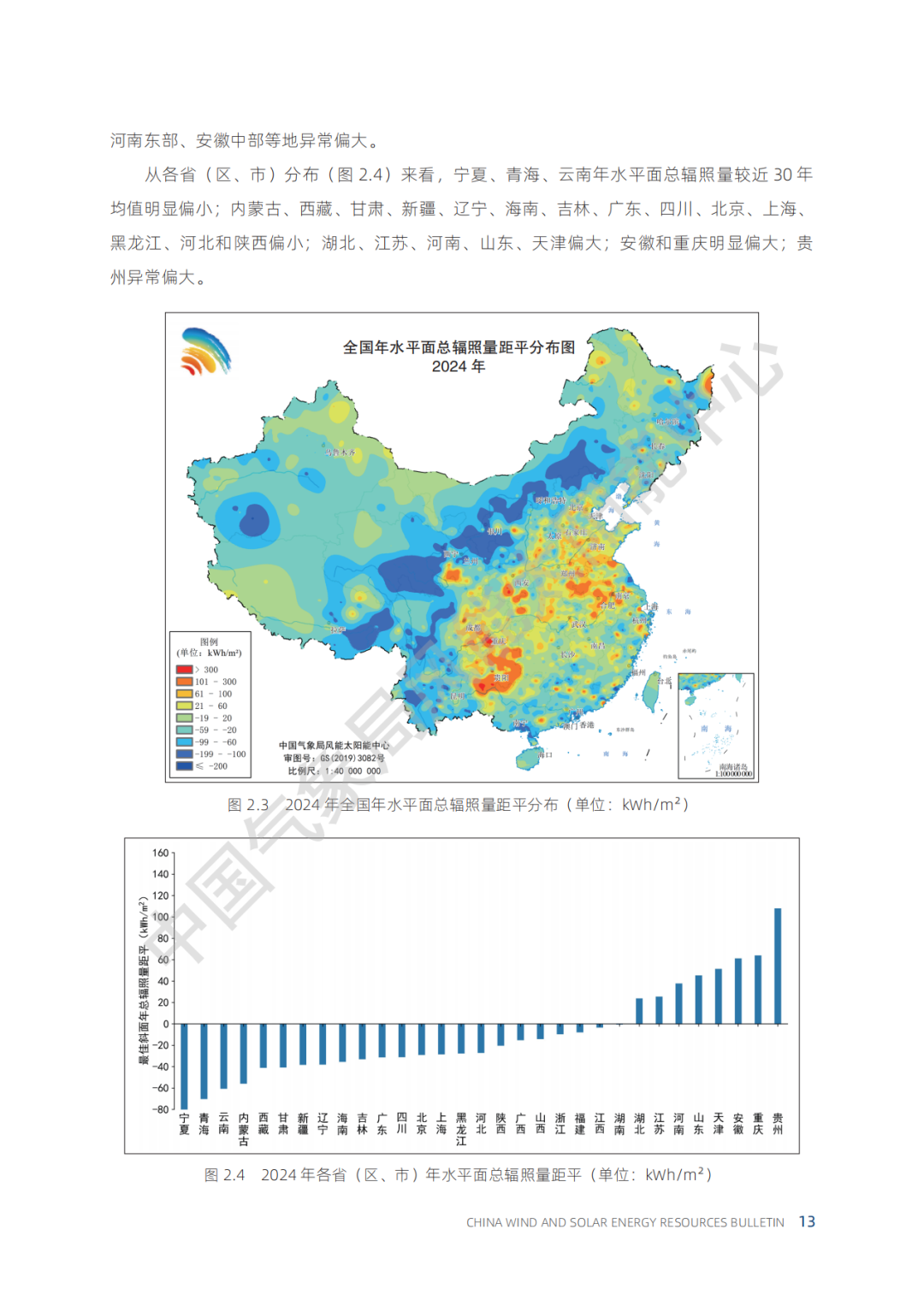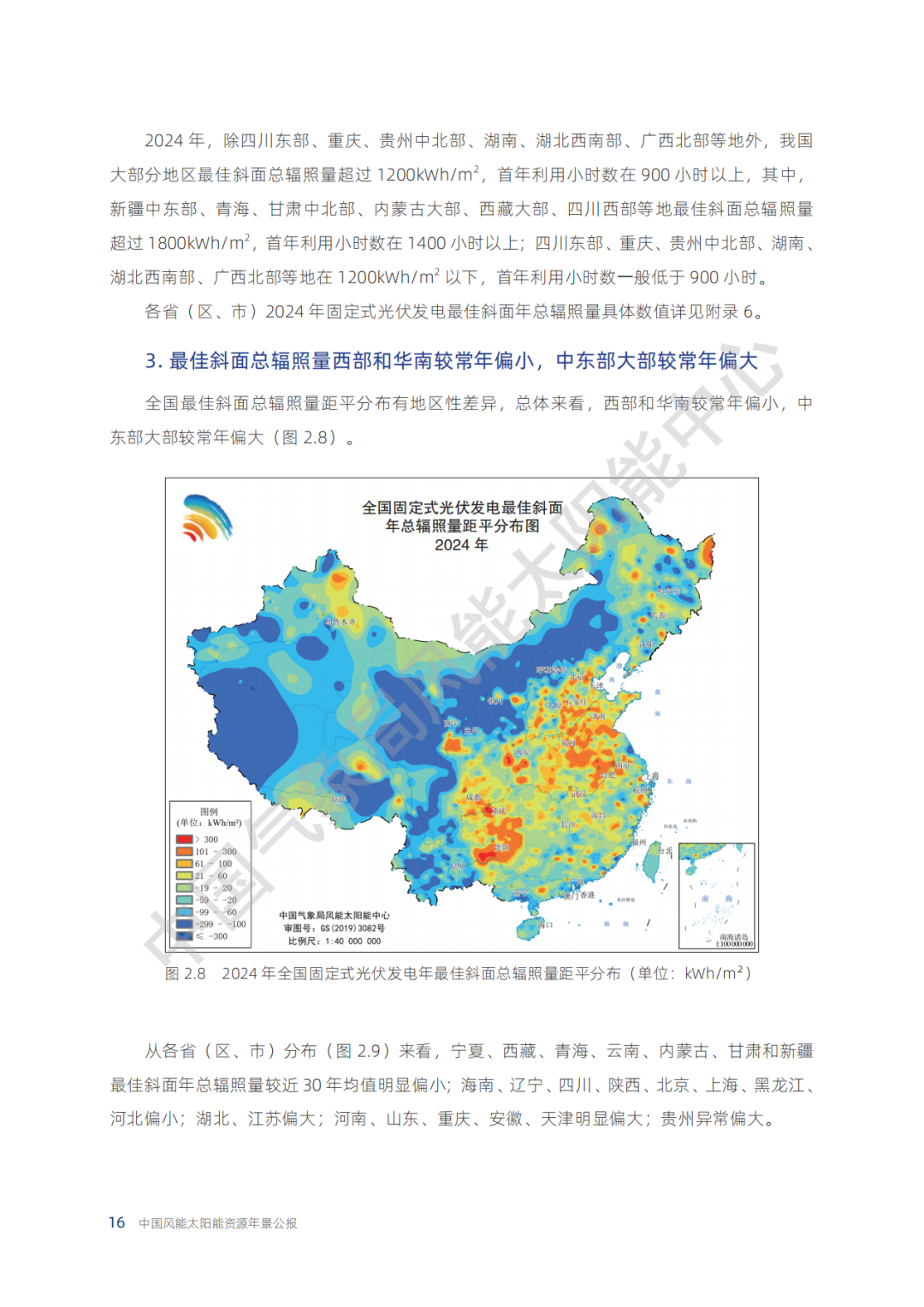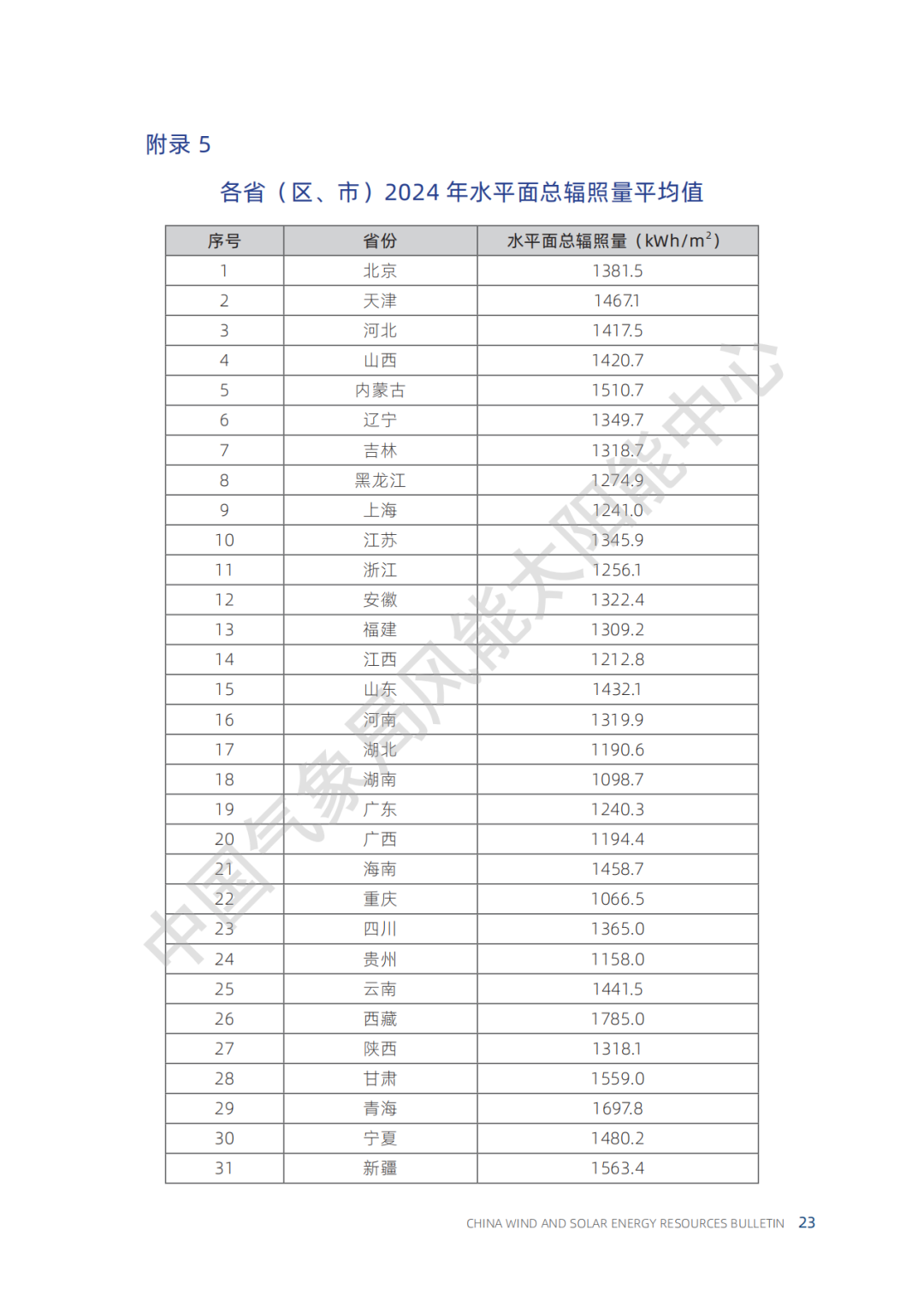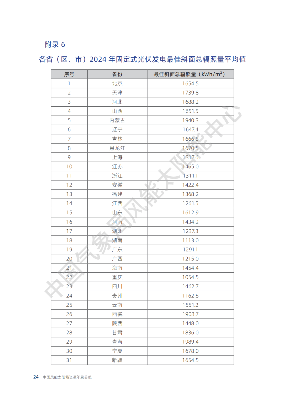 各省(区、市)2024年水平面总辐照量具体数值详见附录 5。