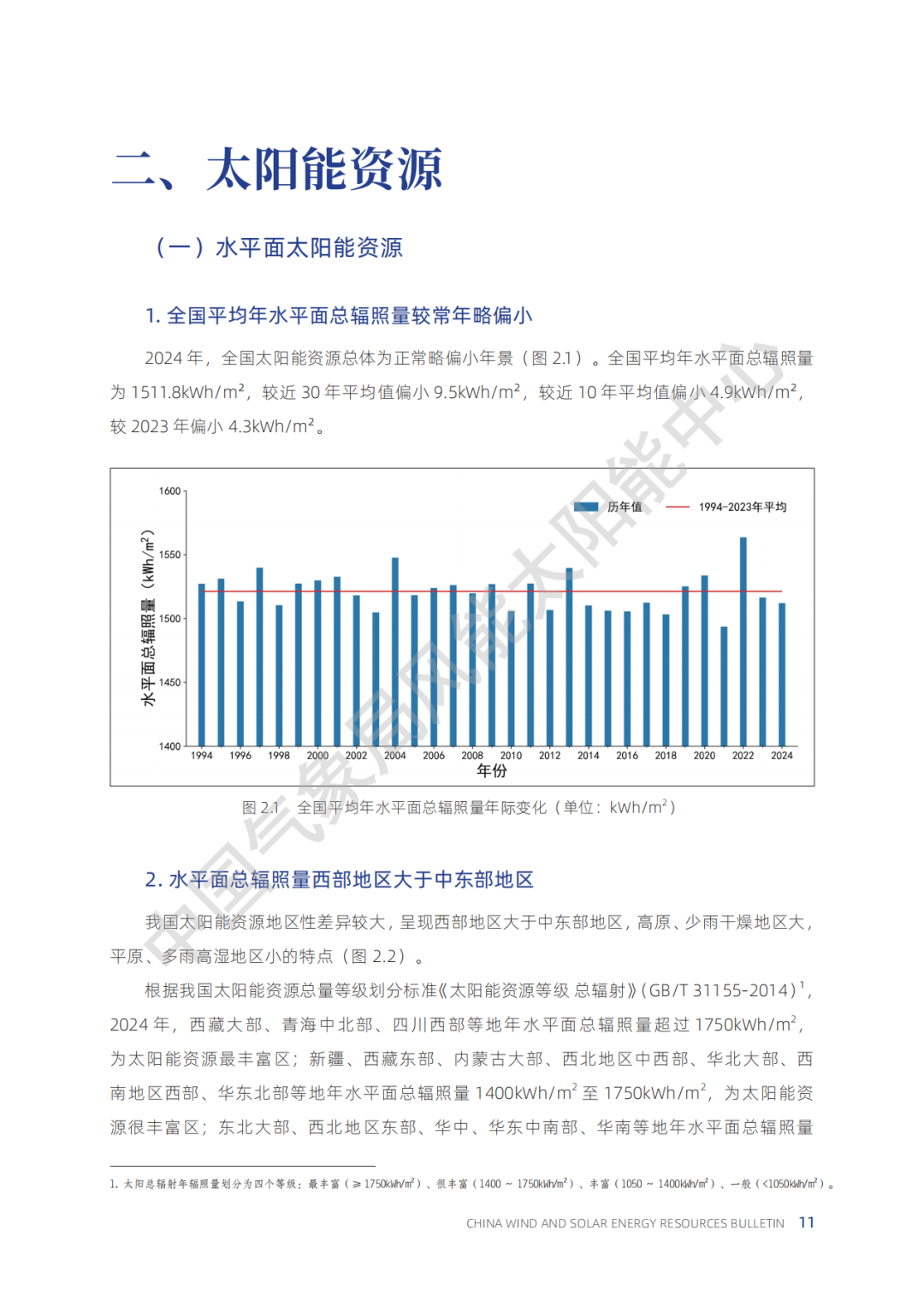 从水平面太阳能资源来看,2024年,全国太阳能资源总体为正常略偏小年景(图2.1)。2024年,全国太阳能资源总体为正常略偏小年景(图 2.1)。全国平均年水平面总辐照量为1511.8kWh/m2, 较近30年平均值偏小 9.5kWh/m2, 较近10年平均值偏小4.9kWh/m2, 较2023年偏小4.3kWh/m2。