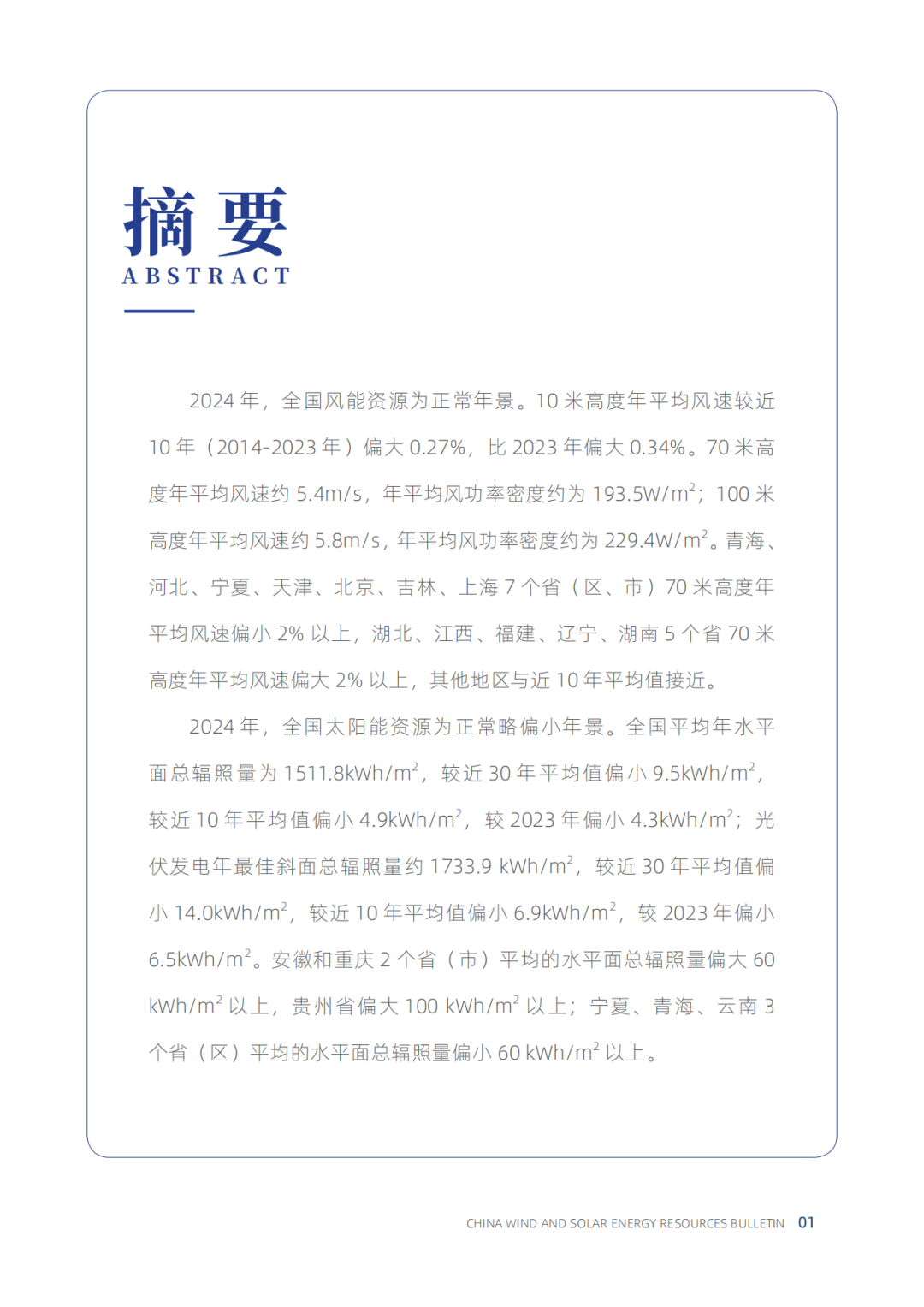具体到各地区空间分布上,资源地区性差异较大。2024年,西藏大部、青海中北部、四川西部等地为太阳能资源最丰富区;新疆、西藏东部、内蒙古大部、西北地区中西部、华北大部、西南地区西部、华东北部等地为太阳能资源很丰富区;东北大部、西北地区东部、华中、华东中南部、华南等地为太阳能资源丰富区;西南地区东部、华中西部等地全国年水平面总辐照量为太阳能资源一般区。据了解,今年是中国气象局风能太阳能中心第十一次发布《中国风能太阳能资源年景公报》。公报结合多个气象平台相关监测评估数据,对2024年全国风能太阳能资源情况和相对过去10年、30年平均资源量变化情况进行了分析。能源行业相关企业可以对2024年度风光发电量进行复盘、评估,分析对应的资源、运维、系统性能等问题,从而针对性优化生产流程,有助于提升发电量与经营效益。附:完整版《2023年中国风能太阳能资源年景公报》